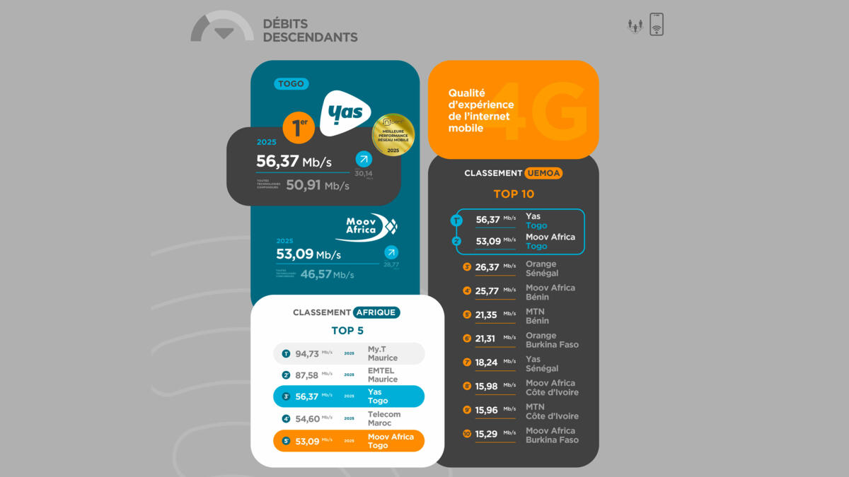 Au niveau continental, les deux sociétés figurent dans le top 10 africain, respectivement 7ème et 9ème toutes technologies confondues. En débit descendant 4G, Yas Togo se hisse à la 3ème place africaine et Moov Africa à la 5ème.